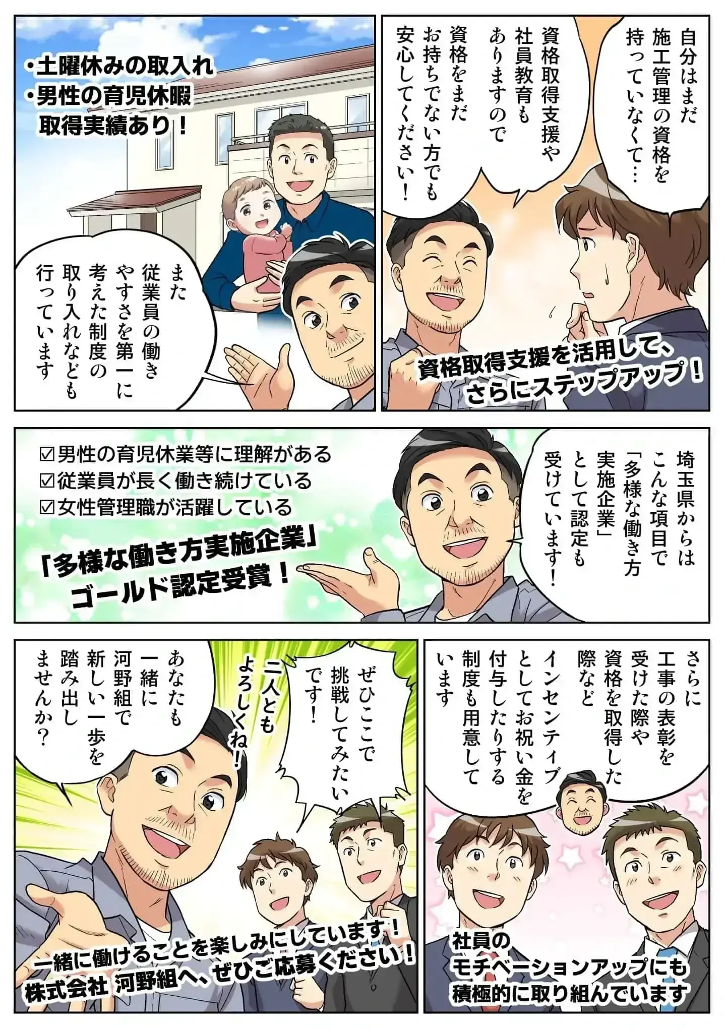 河野組では働きやすさを重視し、建設業には珍しい土曜日休みを導入しています。家族や自分の時間を大切にしながら、仕事とのバランスを守ることができます。